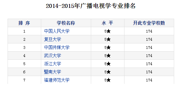 近日,根据中国科学评价研究中心、中国科教评价网和中国教育质量评价中心共同完成的2014~2015年度中国大学及学科专业评价数据显示,我院广播电视学专业喜获五星评价,在全国174个有此专业的学校中位居第七,仅位于中国人民大学、复旦大学、中国传媒大学、武汉大学、浙江大学和暨南大学之后。