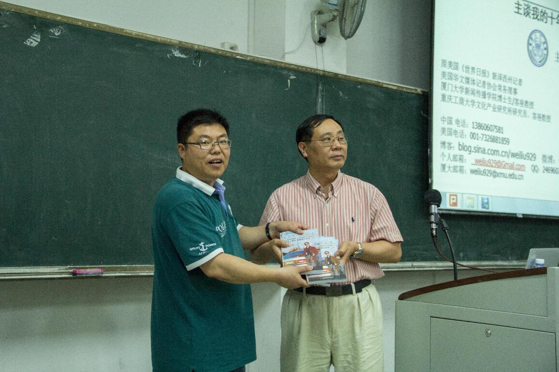 5月20日晚7点,厦门大学美籍客座教授,世界日报前美国新泽西资深记者刘伟做了题为“梦想与精彩同行——主谈我的十年移民与记者生涯”的讲座。传播学院副院长张映辉、2013级辅导员郭虎以及创业培训班学员近百人参加了此次讲座,刘伟老师还向我院赠送了专著书籍十余本。他围绕教师梦、美国梦、记者梦、学者梦四个方面展开,讲述了自己的人生经历。并且通过讲座对传媒产业进行了深度解读以及自己对创业的看法和见解。他还通过放映视频、现场提问等方式为讲座增添了乐趣,让同学们更多地认识了新闻事业的发展情况,也为他们对未来的定位明确了方向。