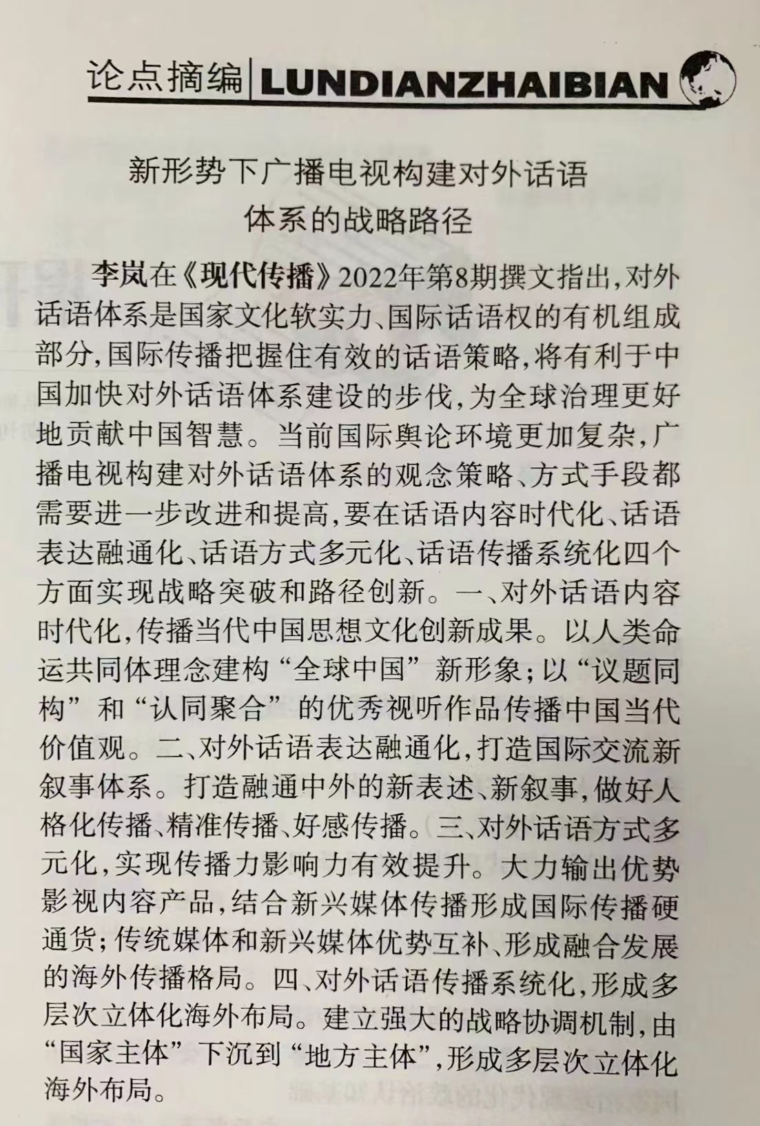 李岚在《现代传播》2022年第8期撰文指出,对外话语体系是国家文化软实力、国际话语权的有机组成部分,国际传播把握住有效的话语策略,将有利于中国加快对外话语体系建设的步伐,为全球治理更好地贡献中国智慧。当前国际舆论环境更加复杂,广播电视构建对外话语体系的观念策略、方式手段都需要进一步改进和提高,要在话语内容时代化、话语表达融通化话语方式多元化、话语传播系统化四个方面实现战略突破和路径创新。一、对外话语内容时代化,传播当代中国思想文化创新成果。以人类命运共同体理念建构“全球中国”新形象;以“议题同构”和“认同聚合”的优秀视听作品传播中国当代价值观。二、对外话语表达融通化,打造国际交流新叙事体系。打造融通中外的新表述、新叙事,做好人格化传播、精准传播、好感传播。三、对外话语方式多元化,实现传播力影响力有效提升。大力输出优势影视内容产品,结合新兴媒体传播形成国际传播硬通货;传统媒体和新兴媒体优势互补、形成融合发展的海外传播格局。四、对外话语传播系统化,形成多层次立体化海外布局。建立强大的战略协调机制,由“国家主体”下沉到“地方主体”,形成多层次立体化海外布局。