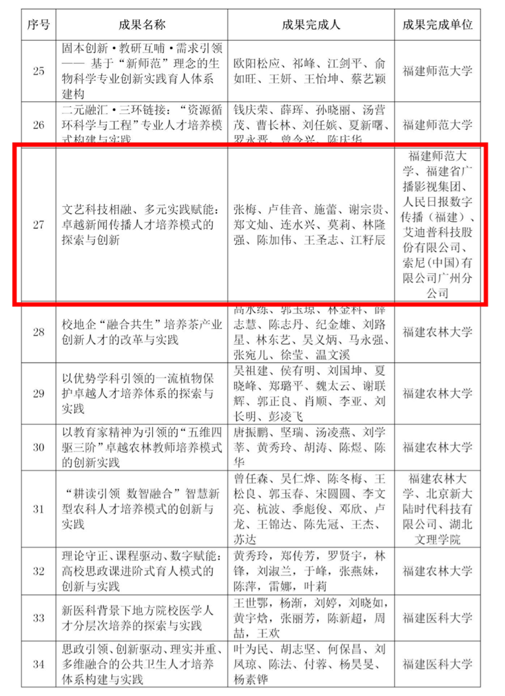 近日,福建省教育厅公布2024年省级教学成果奖获奖名单。其中,我院张梅教授领衔申报的“文艺科技相融、多元实践赋能:卓越新闻传播人才培养模式的探索与创新”,凭借突出创新性与实践成效,荣获高等教育(本科)省级教学成果奖一等奖,实现学院省级教学成果奖的新突破。