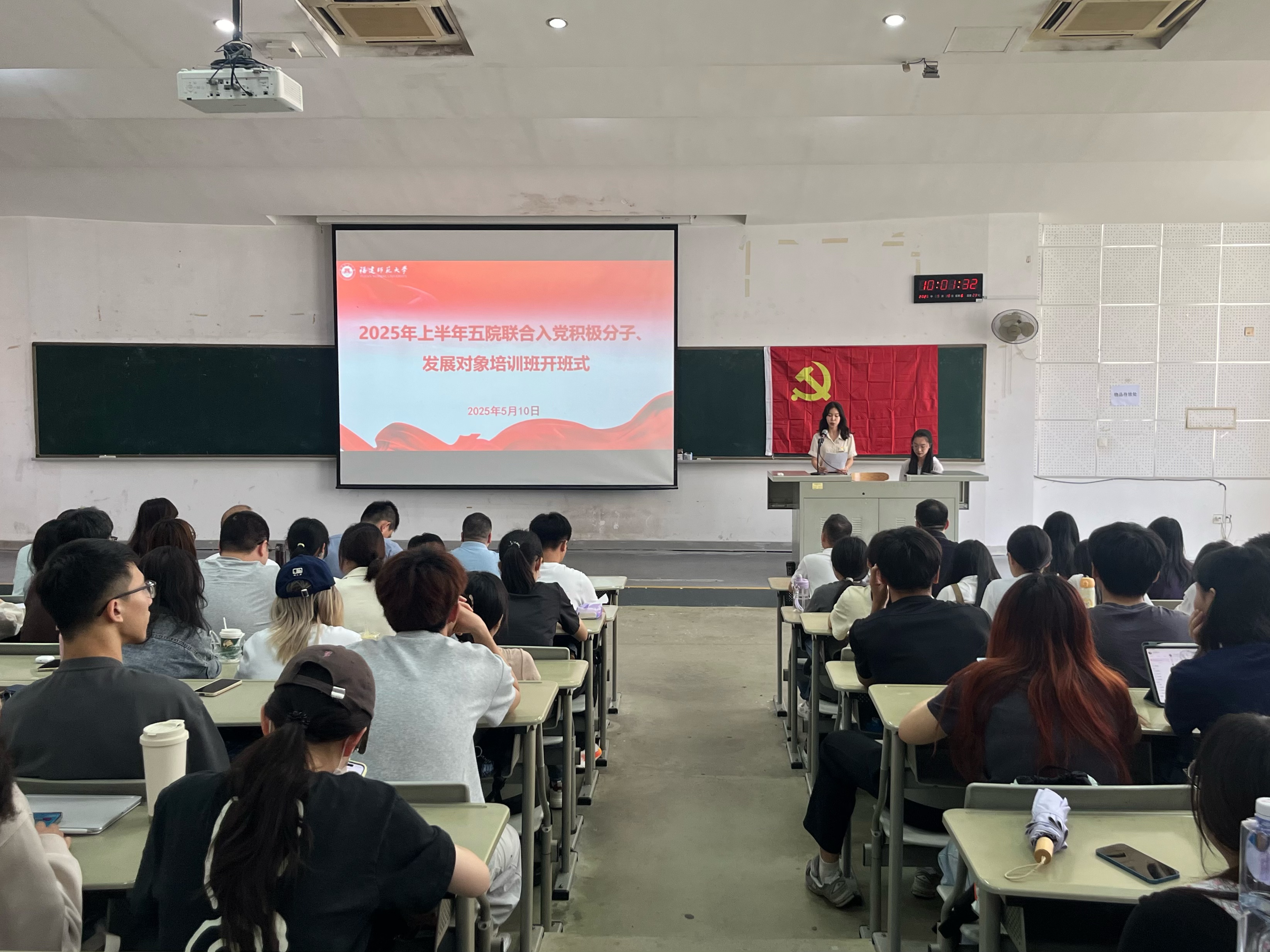 5月10日上午,音乐学院、心理学院、美术学院、化学与材料学院、传播学院联合分党校2025年上半年入党积极分子、发展对象培训班开班式在知明楼2-102举行。传播学院党委书记郑文灿、美术学院党委副书记黄智锋、心理学院党委副书记苏杭、音乐学院党委副书记杜成煜、传播学院党委副书记林子鸿,五学院党委组织员、团委书记、辅导员以及全体学员300余人参加了开班式。开班式由传播学院辅导员冯珍珍主持。