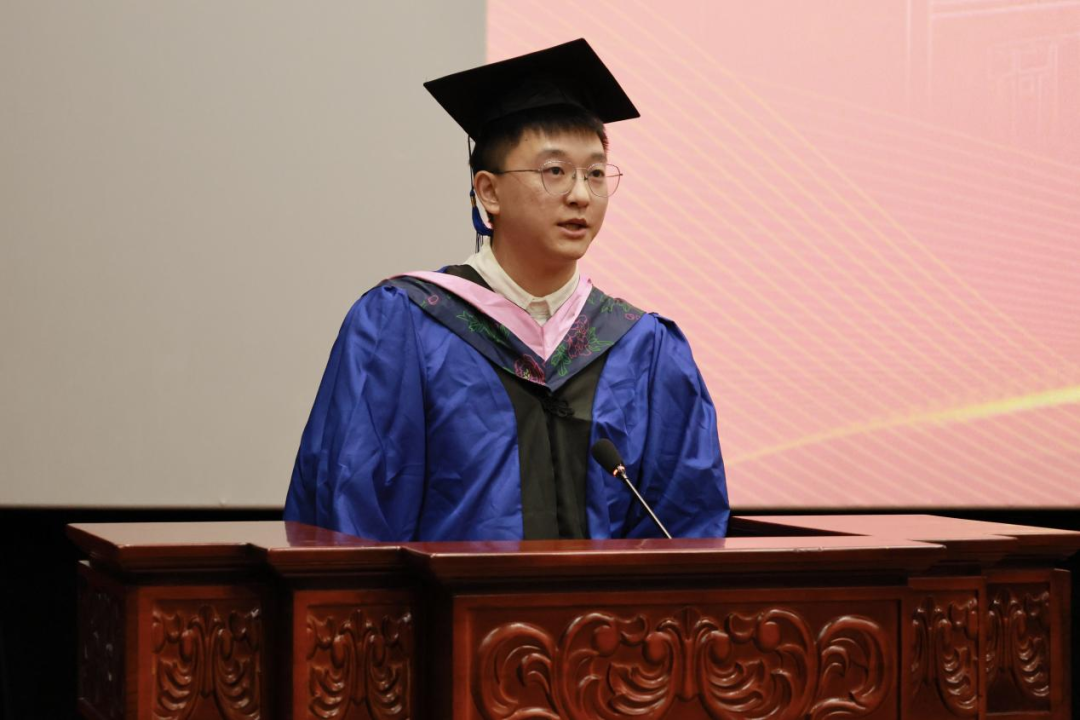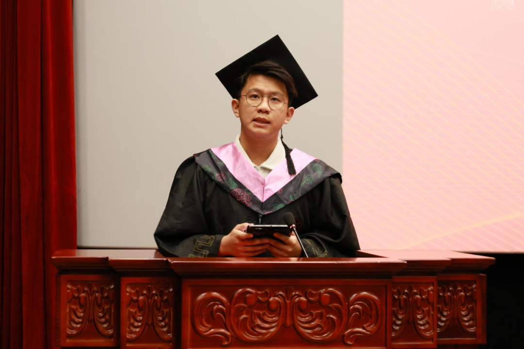 硕士毕业生代表陈文辉发言。他以成长、坚持、选择三个关键词串联求学感悟,表达了对学校、老师和同学们的深切感谢,生动诠释传播学院对个人成长的深远影响。他祝愿传播学院薪火相传,老师们幸福安康,同学们心怀梦想、勇往直前。