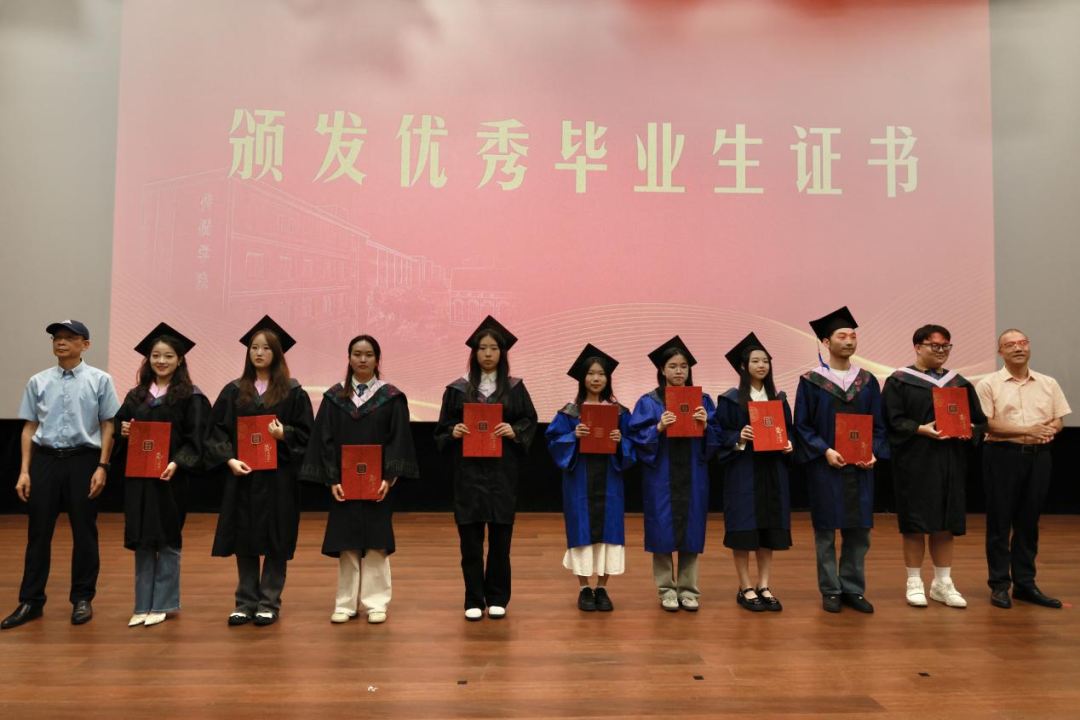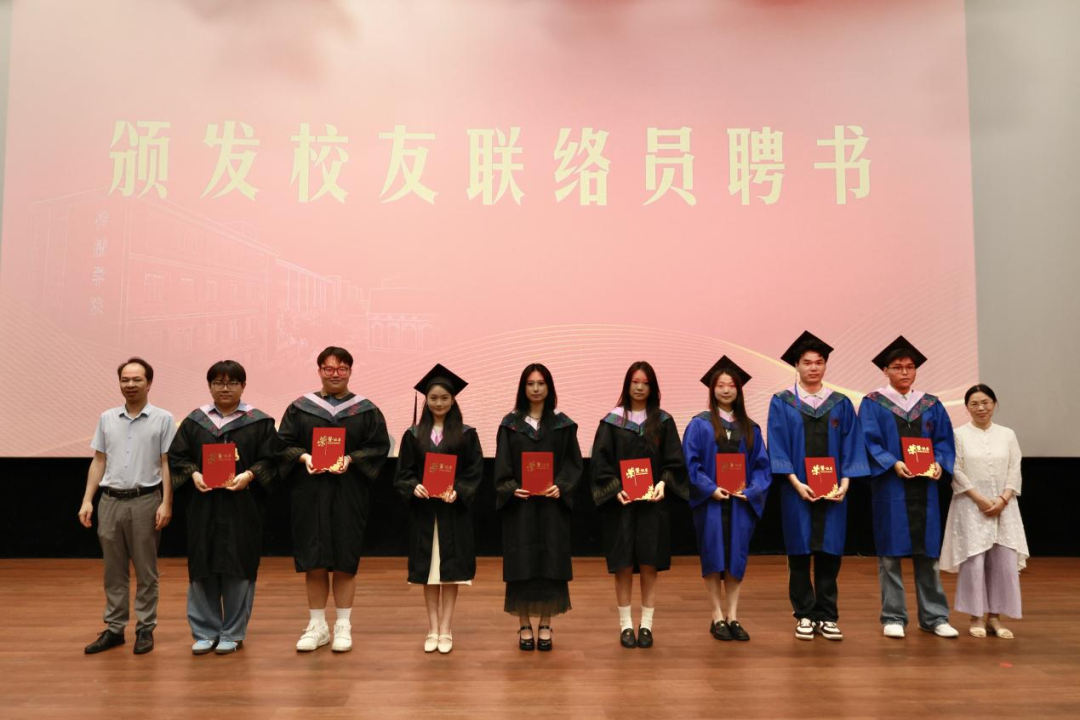 院党委书记郑文灿宣读2025届优秀毕业生名单及校友联络员名单。郑文灿、谢宗贵为优秀毕业生代表颁发证书,副院长连水兴、吴青青为校友联络员颁发聘书。