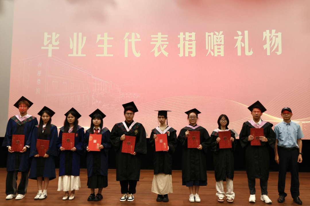 毕业生代表向学院捐赠纪念礼物。2021级本科生胡博荞作为捐赠代表发言,他真挚感谢学院在创新创业道路上给予的专业指导与全力支持,也对同窗好友的陪伴相助表达谢意,愿与同学们一同珍惜青春、勇于追梦。