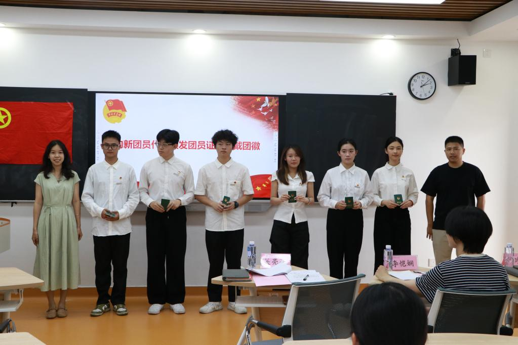 入团仪式在嘹亮的国歌声中开始。院团委副书记黄缨涵首先介绍了入团仪式的重要意义,并宣读了新团员的名单。辅导员吴亮亮老师和冯珍珍老师为新团员颁发团员证并佩戴团徽。在鲜红的团旗前,新团员代表孙云衣带领新团员进行了庄严的宣誓。