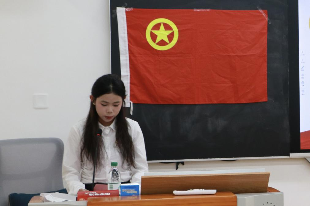 优秀团员代表,2024级新闻传播学类专业的沈彦宏发言,她表示,热烈欢迎新团员们加入中国共青团这个光荣的集体。团员不仅是身份,更是沉甸甸的家国责任。她用三个“始终”与新团员们共勉,希望团员们能铭记团旗下的庄严承诺,用激情和汗水续写共青团的辉煌篇章。
