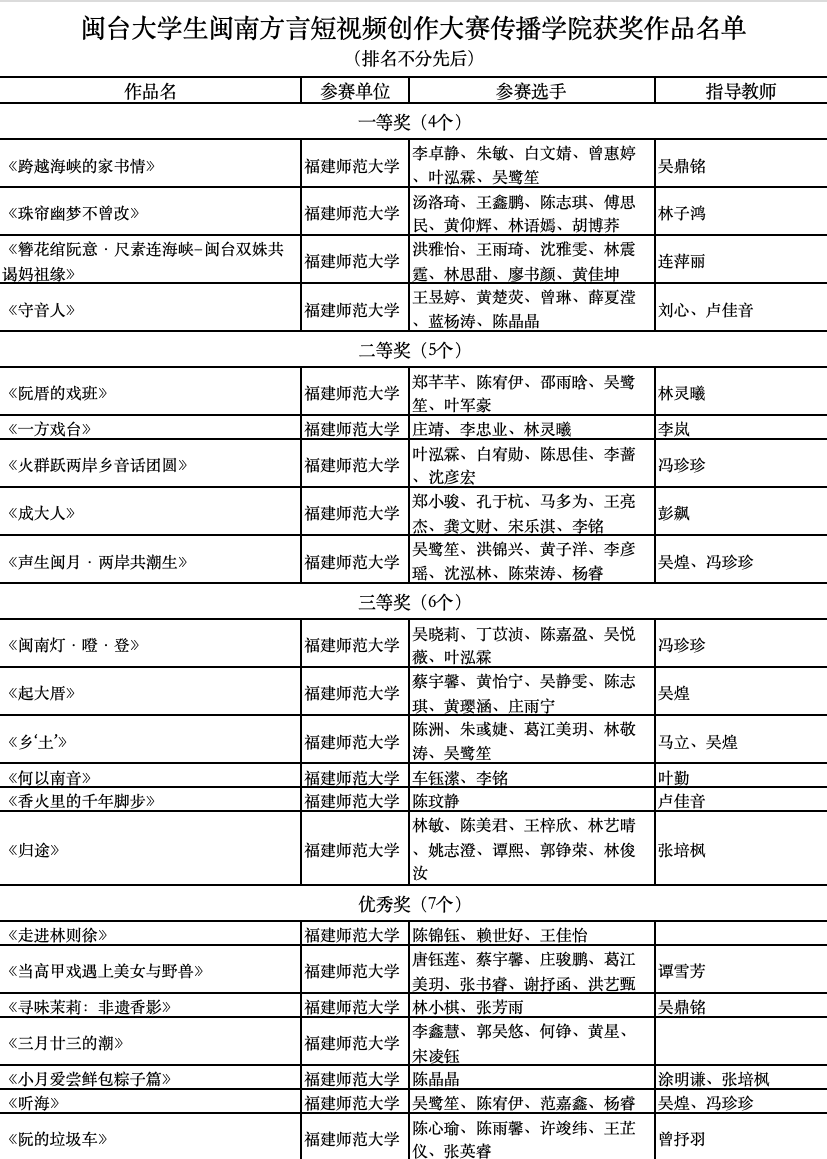 近日,福建省教育厅公布了《关于公布 2025年闽台大学生闽南方言短视频创作大赛获奖名单的通知》(闽教便函〔2025〕897号)。传播学院师生作品共斩获省级一等奖4项、二等奖5项、三等奖6项、优秀奖7项。同时,福建师范大学荣获“优秀组织单位”称号。