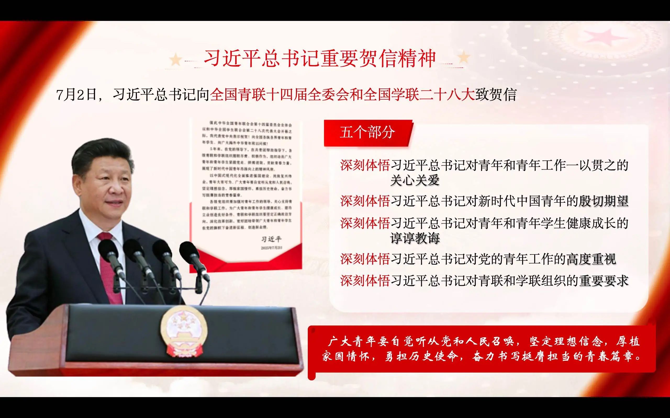 2025年7月2日上午,中华全国青年联合会第十四届委员会全体会议、中华全国学生联合会第二十八次代表大会在京开幕。中共中央总书记、国家主席、中央军委主席习近平发来贺信,代表党中央表示祝贺,向全国各族各界青年和青年学生、向广大海外中华青年致以问候。