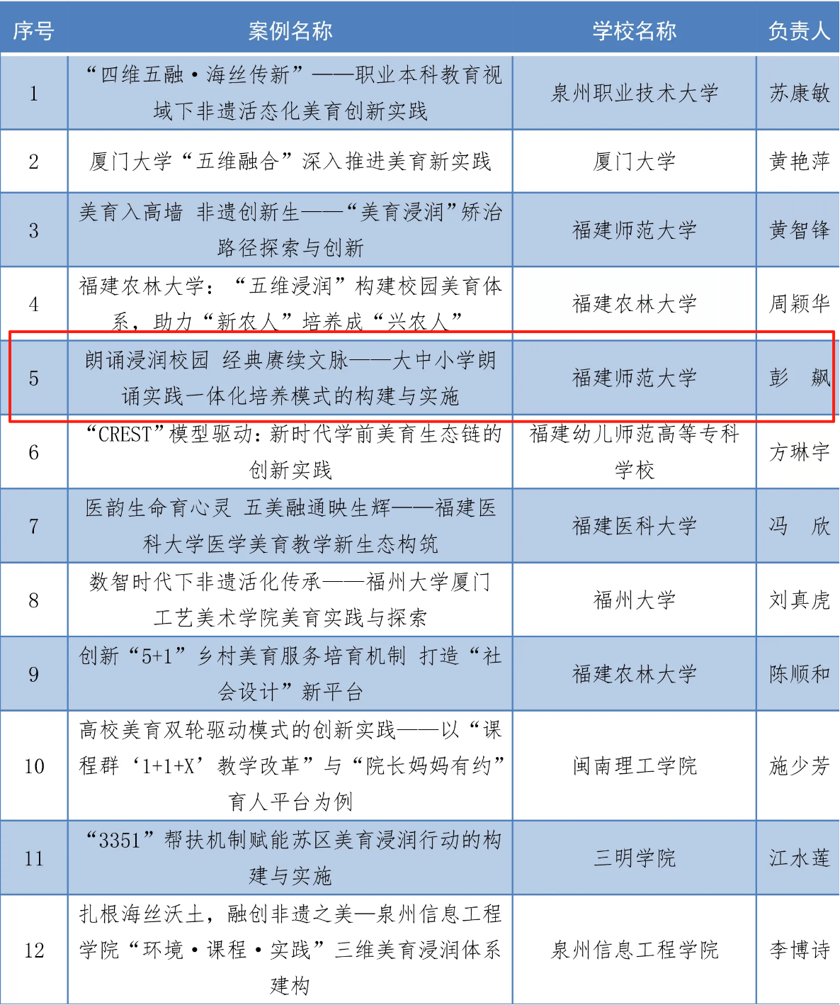 近日,根据省教育厅印发《关于公布2025年福建省学校美育浸润行动优秀案例的通知》,经专家评审、网上公示,确定2025年福建省学校美育浸润行动优秀案例101个。其中,我院播音与主持艺术系主任彭飙副教授牵头申报的案例入选省美育浸润优秀案例。