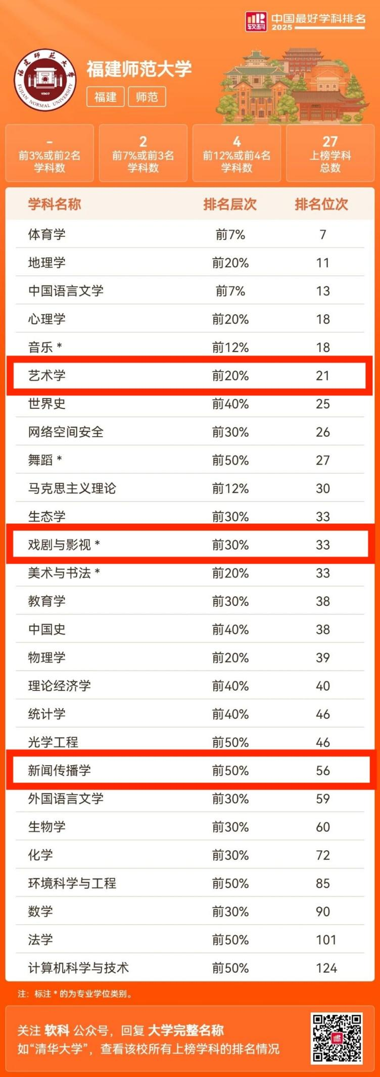 软科中国最好学科排名通过学生质量、科研成果、学科实力等多方面对高校学科进行量化打分,是检验学校教学成果的重要平台,更是体现高校教学水平与质量的重要标志。此次榜单我校共27个学科上榜,较上年新增5个,位列全国高校第60名、双非高校第5名、师范类院校第9名、福建省属高校第1名。