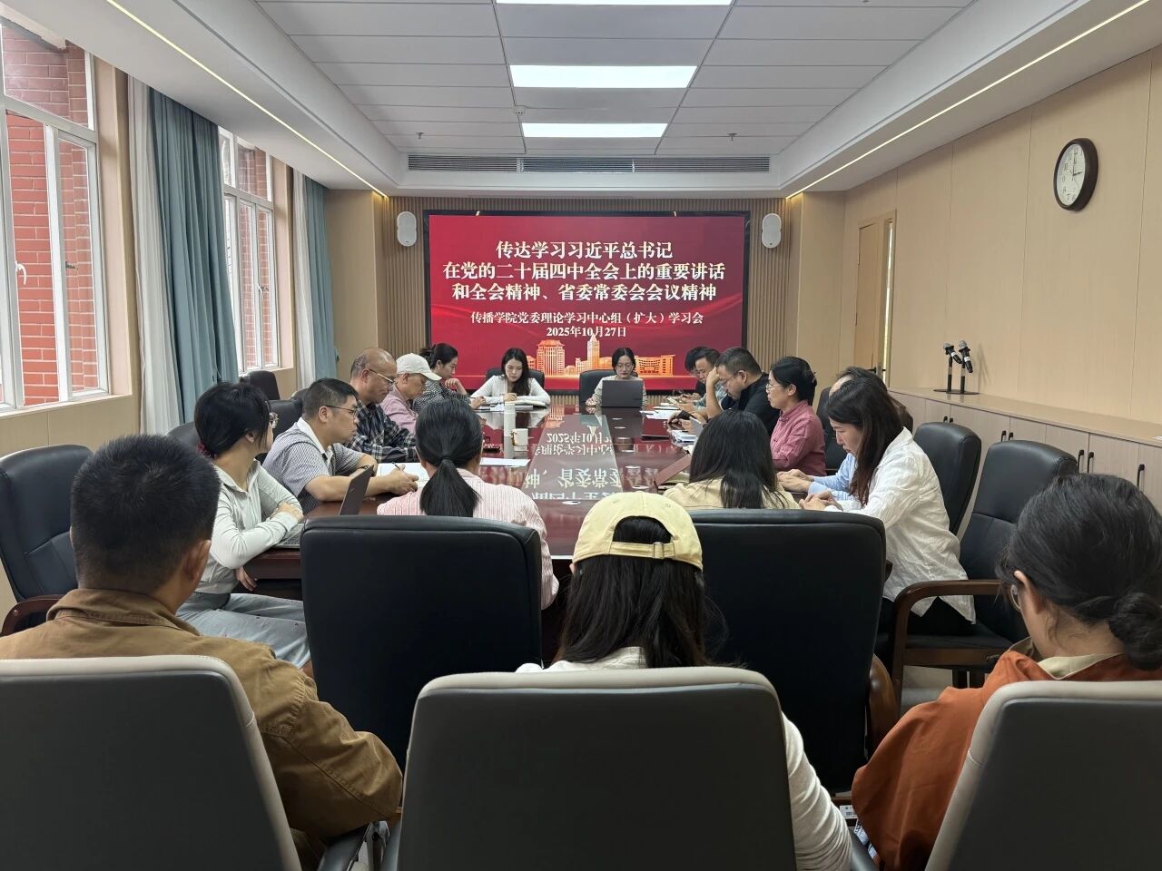 10月27日下午,传播学院党委理论学习中心组(扩大)学习会在学院401会议室举行,传达学习习近平总书记在党的二十届四中全会上的重要讲话和全会精神、省委常委会(扩大)会议精神。院党委理论学习中心组成员、科级干部、师生党支部书记出席会议。会议由院党委书记郑文灿主持。