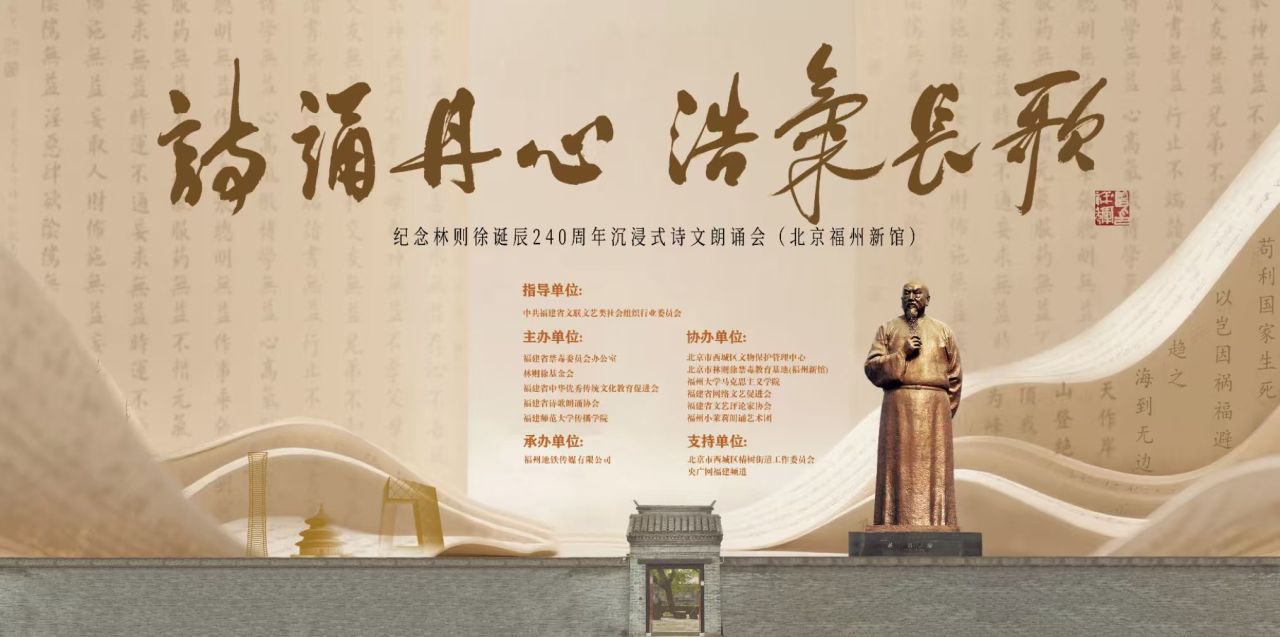 11月2日,由我院参与主办的“诗诵丹心 浩气长歌——纪念林则徐诞辰240周年沉浸式诗文朗诵会”在北京市林则徐禁毒教育基地举行。公安部、北京市、福建省禁毒系统及中国禁毒基金会相关领导,北京市西城区有关单位、福建省委组织部、福建省文联以及社会各界人士出席该活动。活动由福建省文联党组成员、副主席、书记处书记、行业党委书记曾章团主持,福建省人大常委会原副主任林强、林则徐基金会会长林尧为活动致辞,央广网等媒体做了报道。