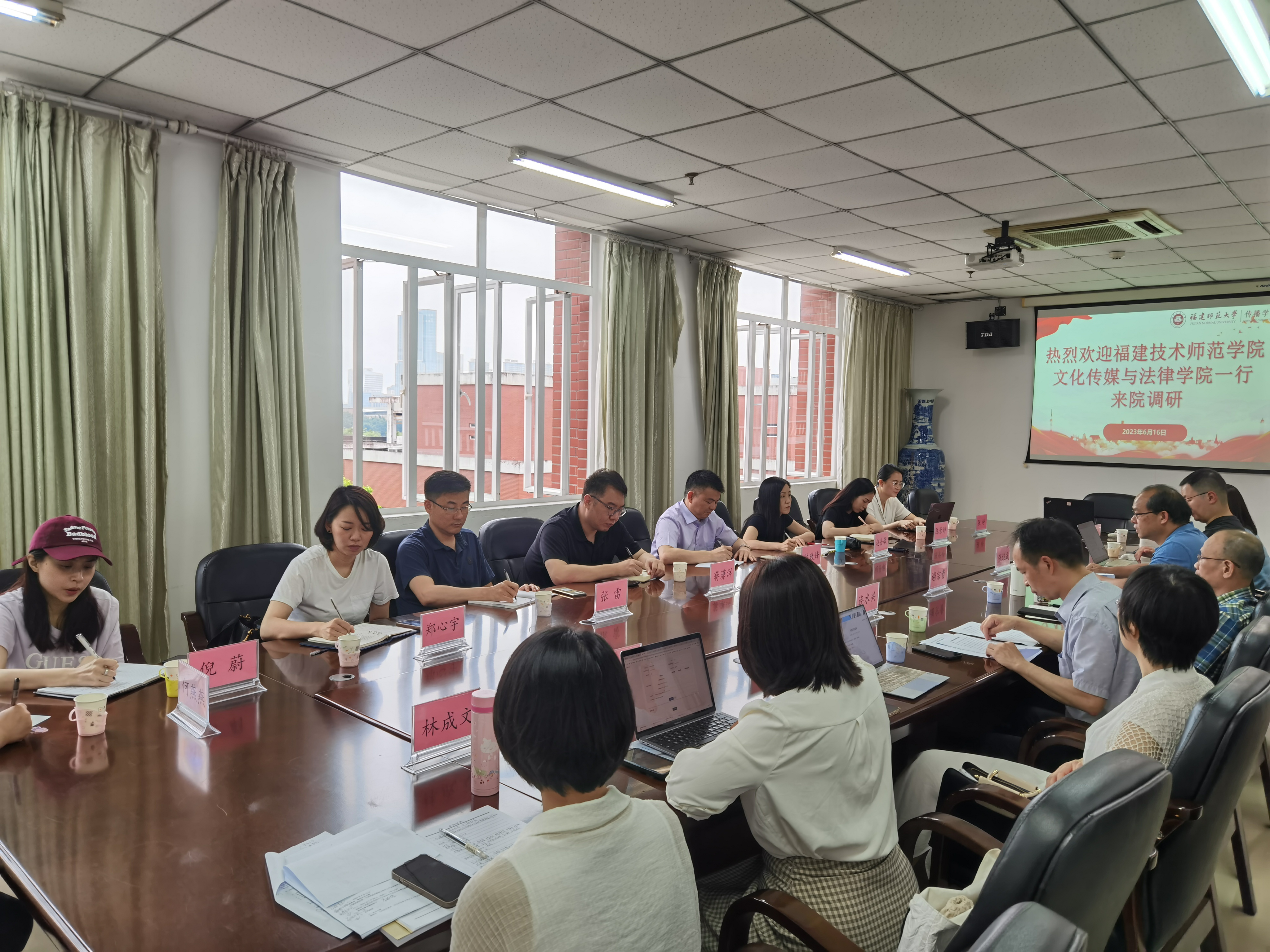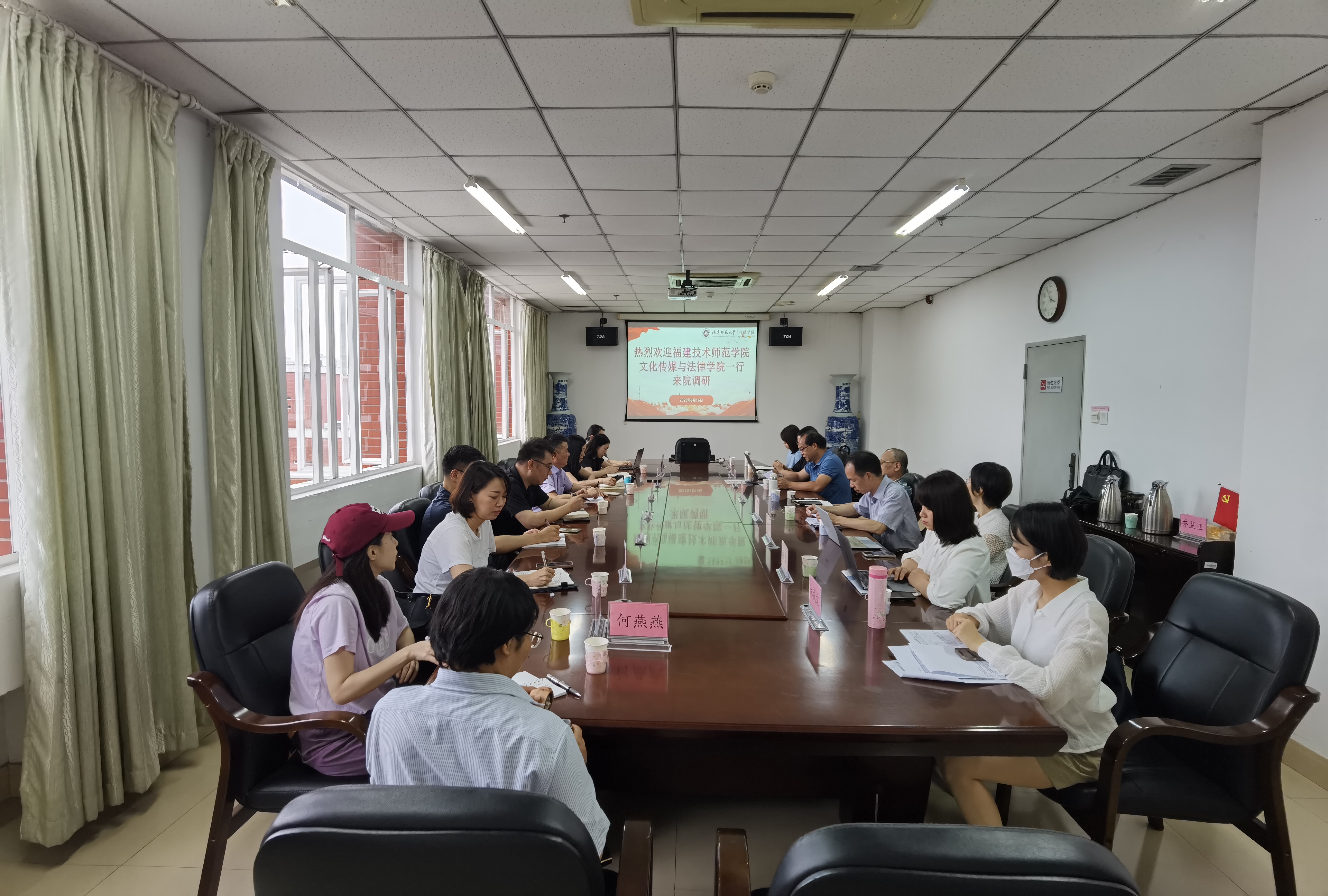 6月16日,福建技术师范学院文化传媒与法律学院院长陈致烽一行10人来我院调研,并于我院四楼会议室开展专业交流座谈会。院长谢宗贵,副院长连水兴,院务委员叶勤,影视艺术系主任张经武,实践实验中心高级实验师施蕾等专业教师代表参加。