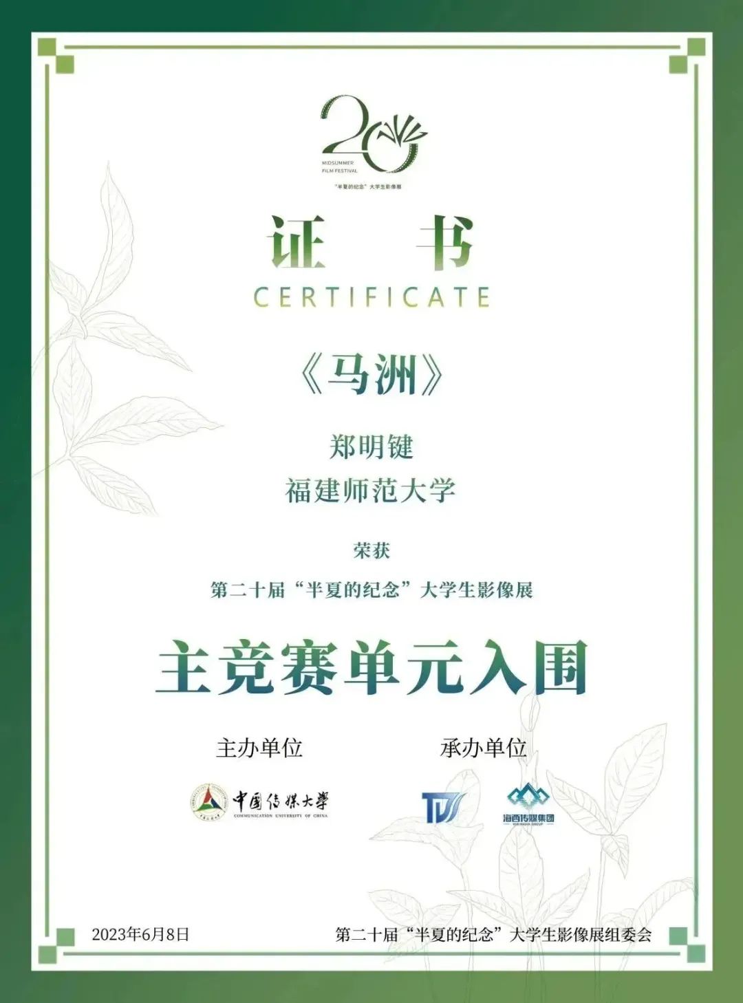 近日,第二十届“半夏的纪念”北京(国际)大学生影像展推选公布了入围名单,我院2021级广播电视专业研究生郑明键(编剧、导演)、郑颖(制片主任)、刘芳、张文馨(美术指导)、黄予巍(声音指导)等人凭借短片《马洲》成功入围主竞赛单元。