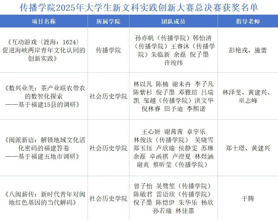 近日,2025年全国大学生新文科实践创新大赛决赛在陕西西安圆满落幕。其中,我院团队历时三个月、跨学科打造的作品《互动游戏〈渡海:1624〉促进海峡两岸青年文化认同的创新实践》及我院师生参与的多项作品在本次大赛中获得金奖。