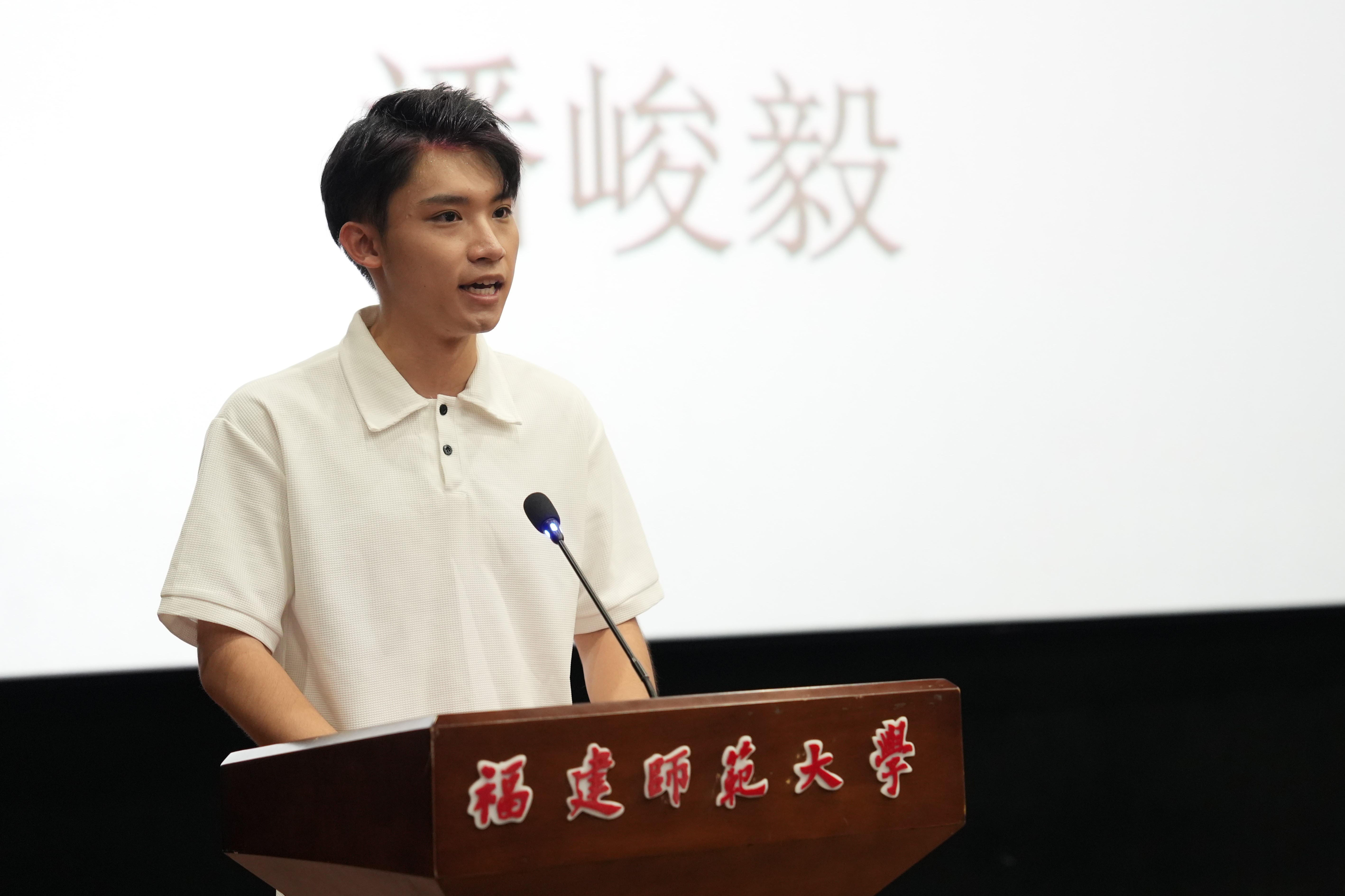 2021级播音与主持艺术专业潘峻毅作为学生代表发言,表示将以大学生的视角,发挥专业特长与十足热忱,实地学习和感受,将宁德山海间的淳朴人情和真挚故事讲给更多的人听。