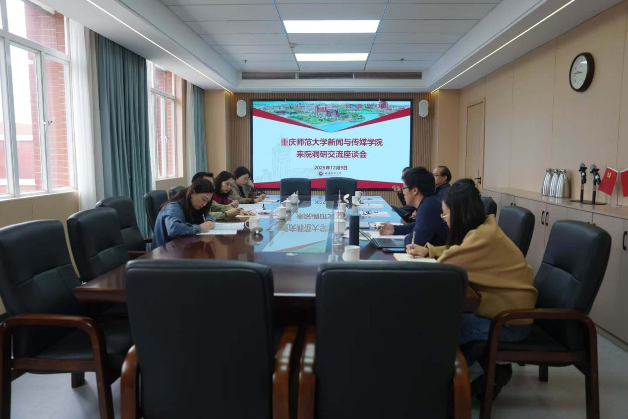 在学院四楼会议室,我院与重庆师范大学一行进行交流座谈。重庆师范大学新闻与传媒学院副院长杨琪、新闻学部主任王欢妮、新闻与传播专业硕士点负责人杨帆、教学科研办公室主任毛丽娜,我院院长谢宗贵、副院长吴青青、艺术学(影视方向)博士学位点负责人张经武、戏剧与影视专业硕士学位点负责人侯凯、新闻与传播专业硕士点负责人吴鼎铭、学科平台办主任蔺义桥参加,会议由吴青青主持。