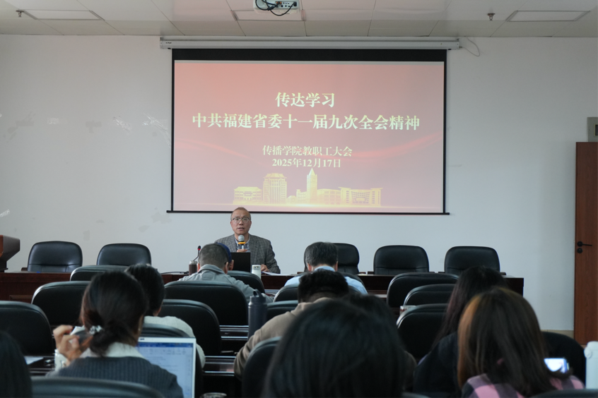 会议强调,一要坚持深学细悟。要学习贯彻中共福建省委十一届九次全会精神,以强化政治建设为核心,筑牢党建引领根基,严格落实省委的行动部署及学校相关要求。二要服务两岸融合发展大局。要依托中华文化传承与两岸融合发展数智实验室“两岸社会心态与舆情研判”子实验室、闽台“4+0”合作办学项目等,推动两岸交流走深走实。三要提升办学质效。要完善人才培养体系,加强戏剧与影视学专业博士点建设,加快申报新闻传播学一级学科博士点,持续优化学科生态,全力创建一流学科。