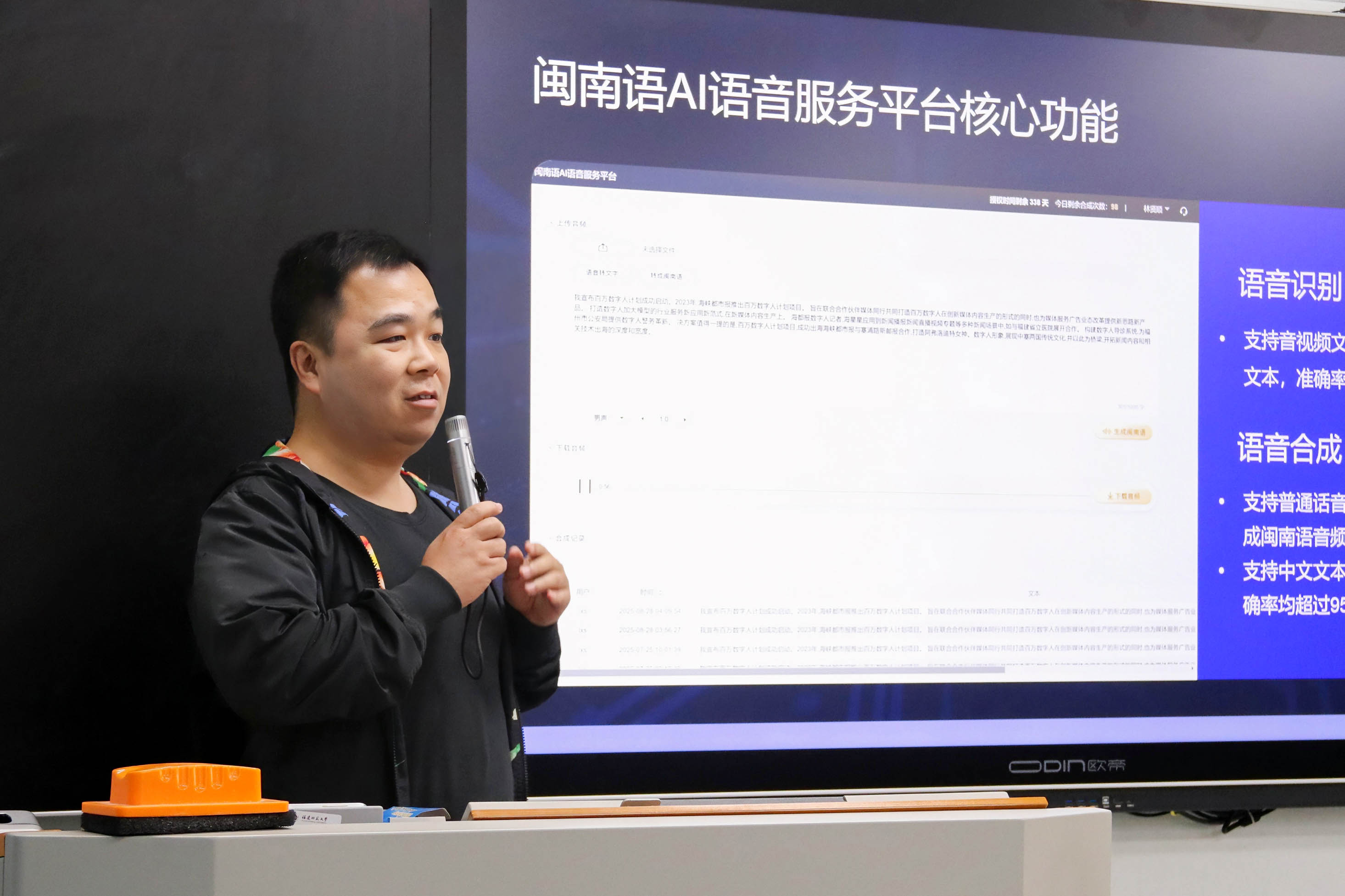 座谈会上,林贤顺详细解读了闽南语AI语音服务平台的核心原理与功能特点,重点介绍其闽南语语音转换、语音合成等精准化功能,并现场演示平台操作流程,让师生直观感受技术应用场景。