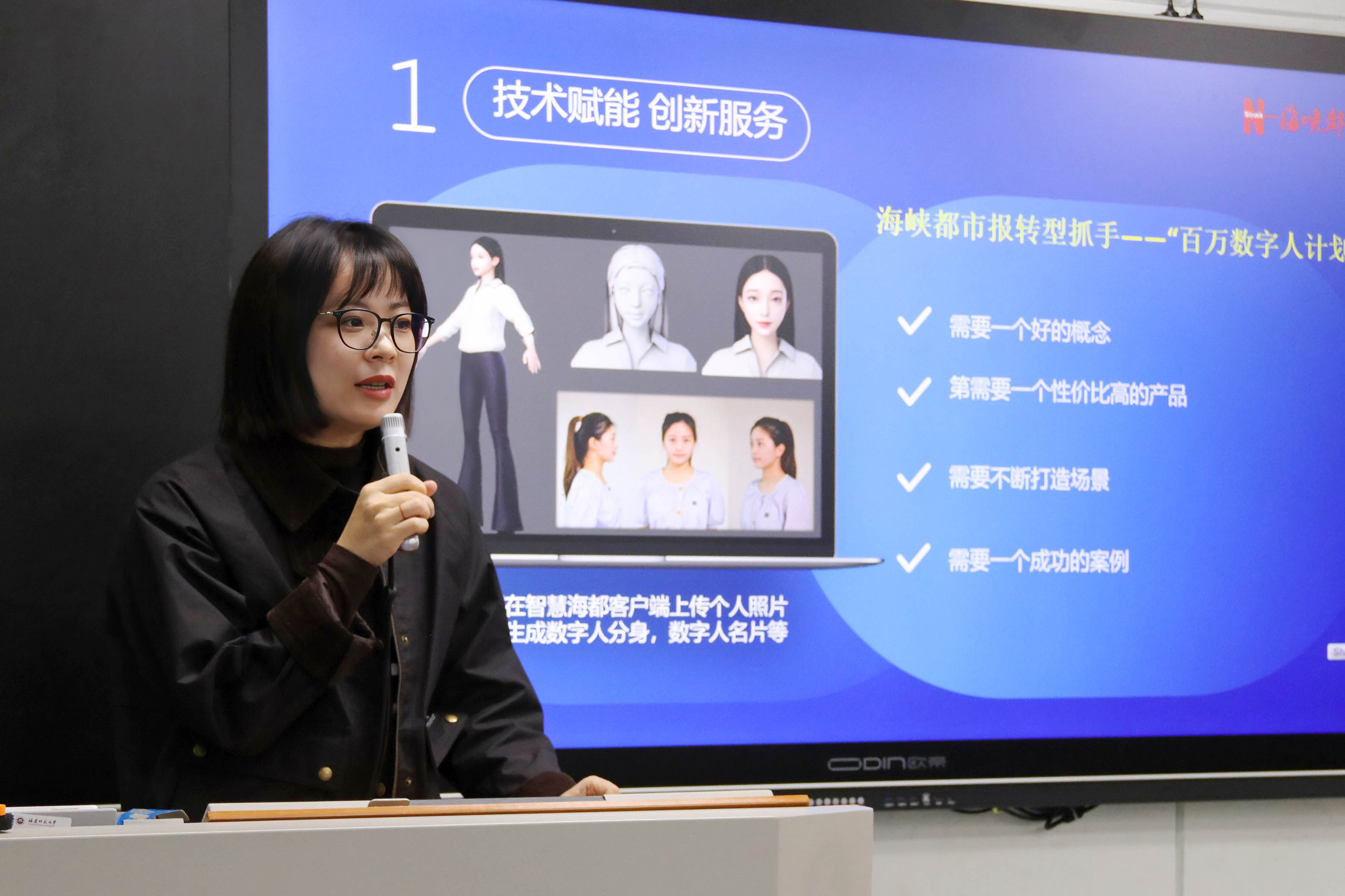 肖颖展示了海峡都市报多年来丰硕的数字化传播成果,重点介绍了闽南语AI语音服务平台,并表示AI闽南语生产领域前景广阔,海峡都市报社将会持续为传院学子提供多元化实践渠道和广阔的实践平台。