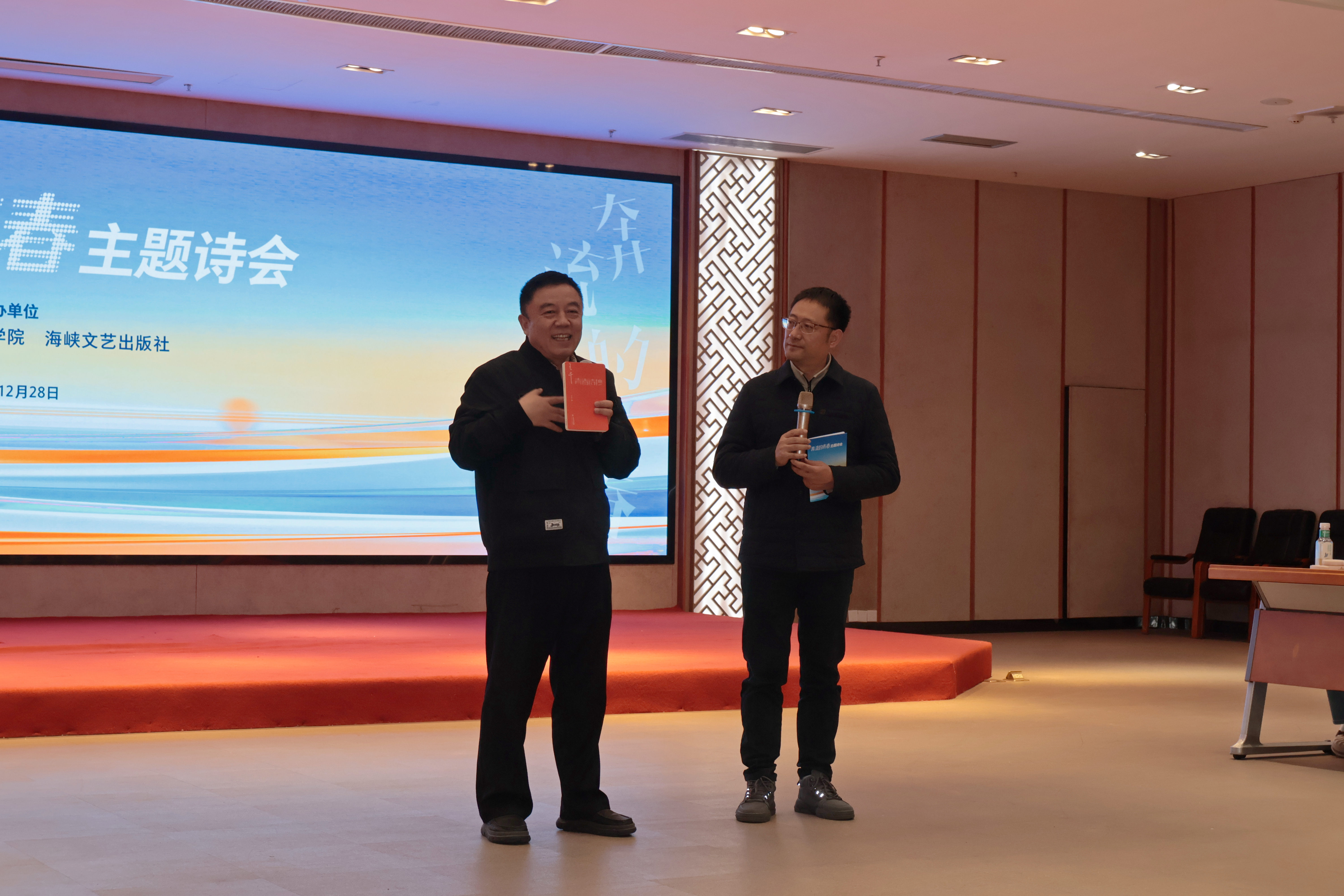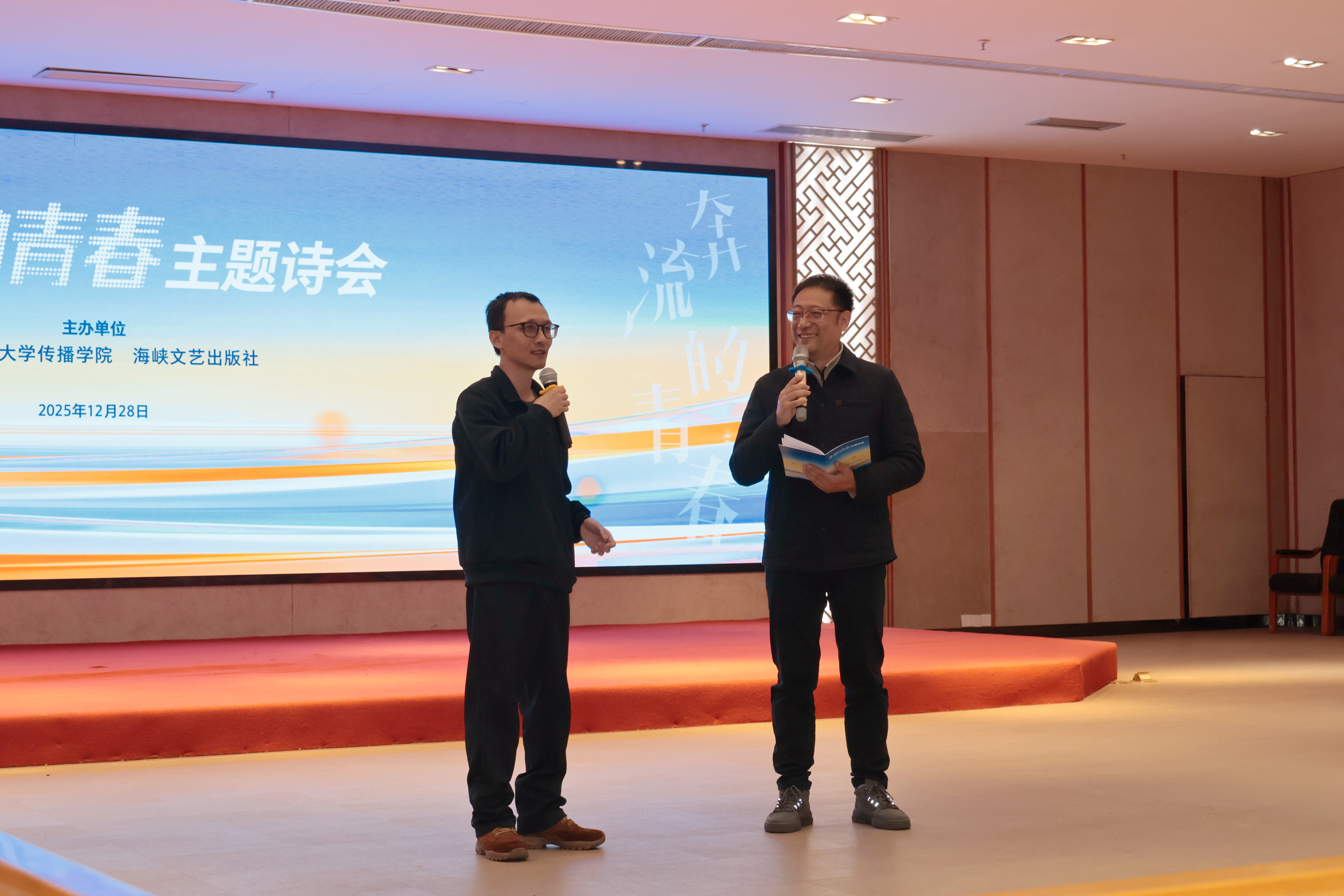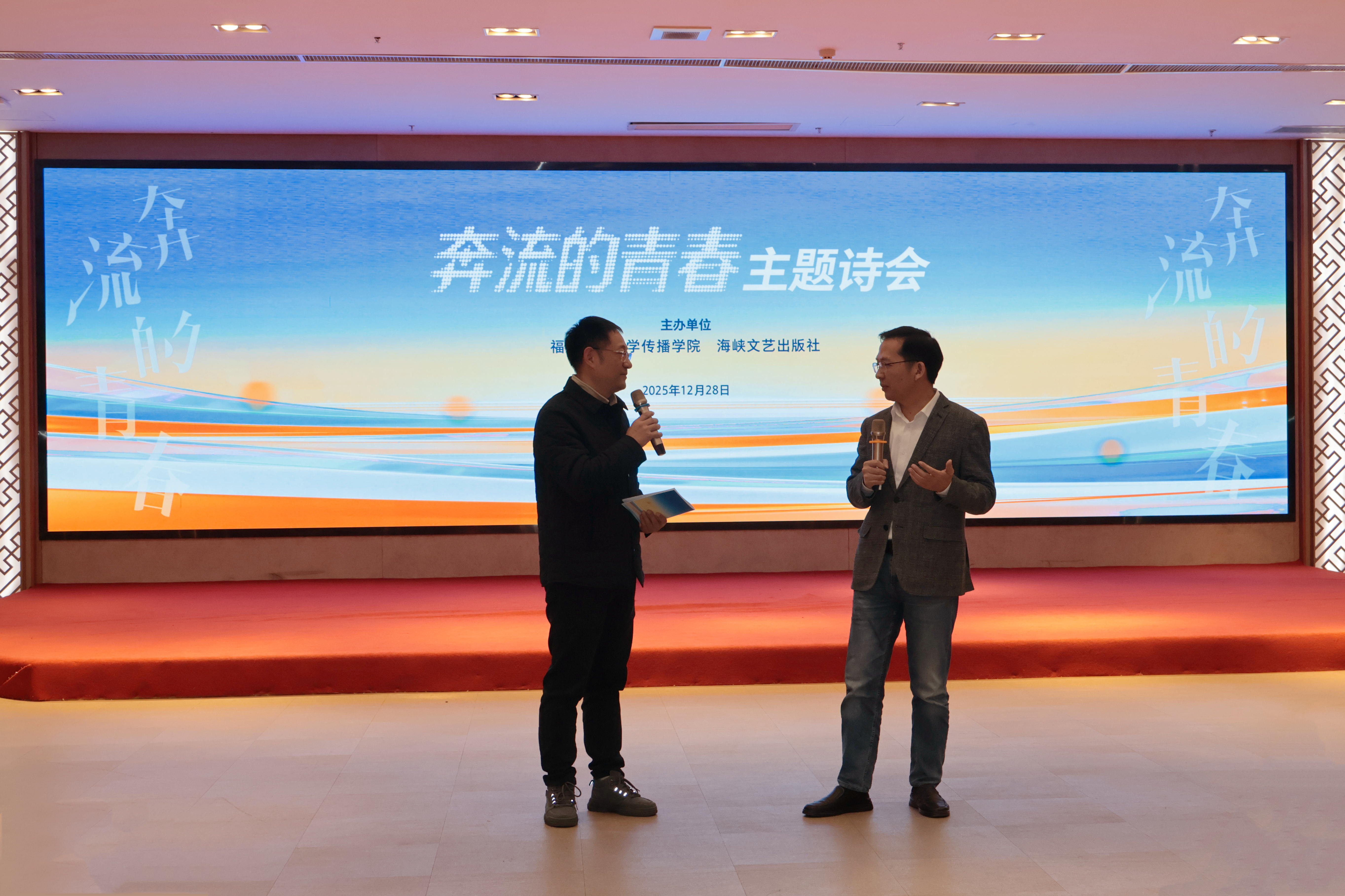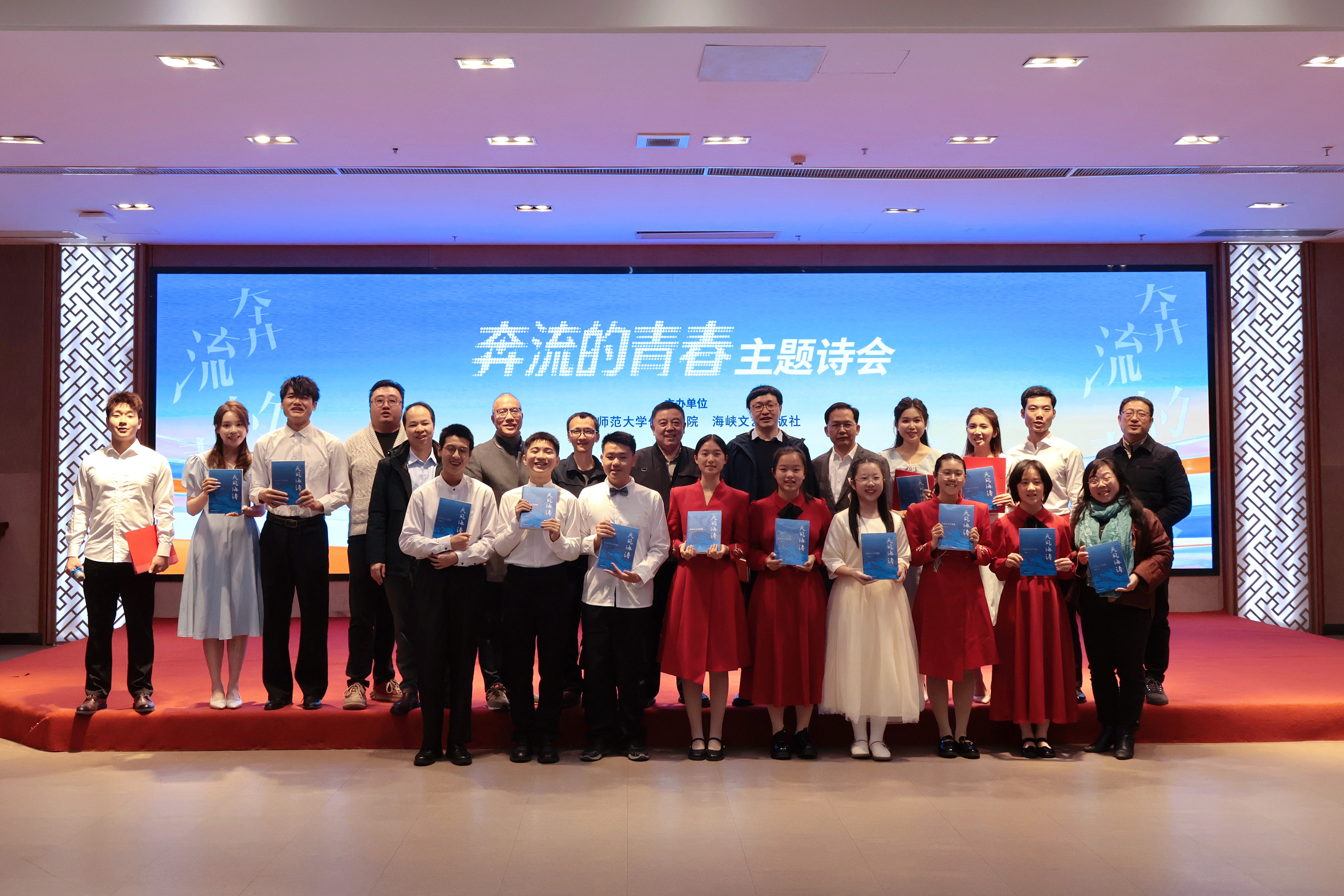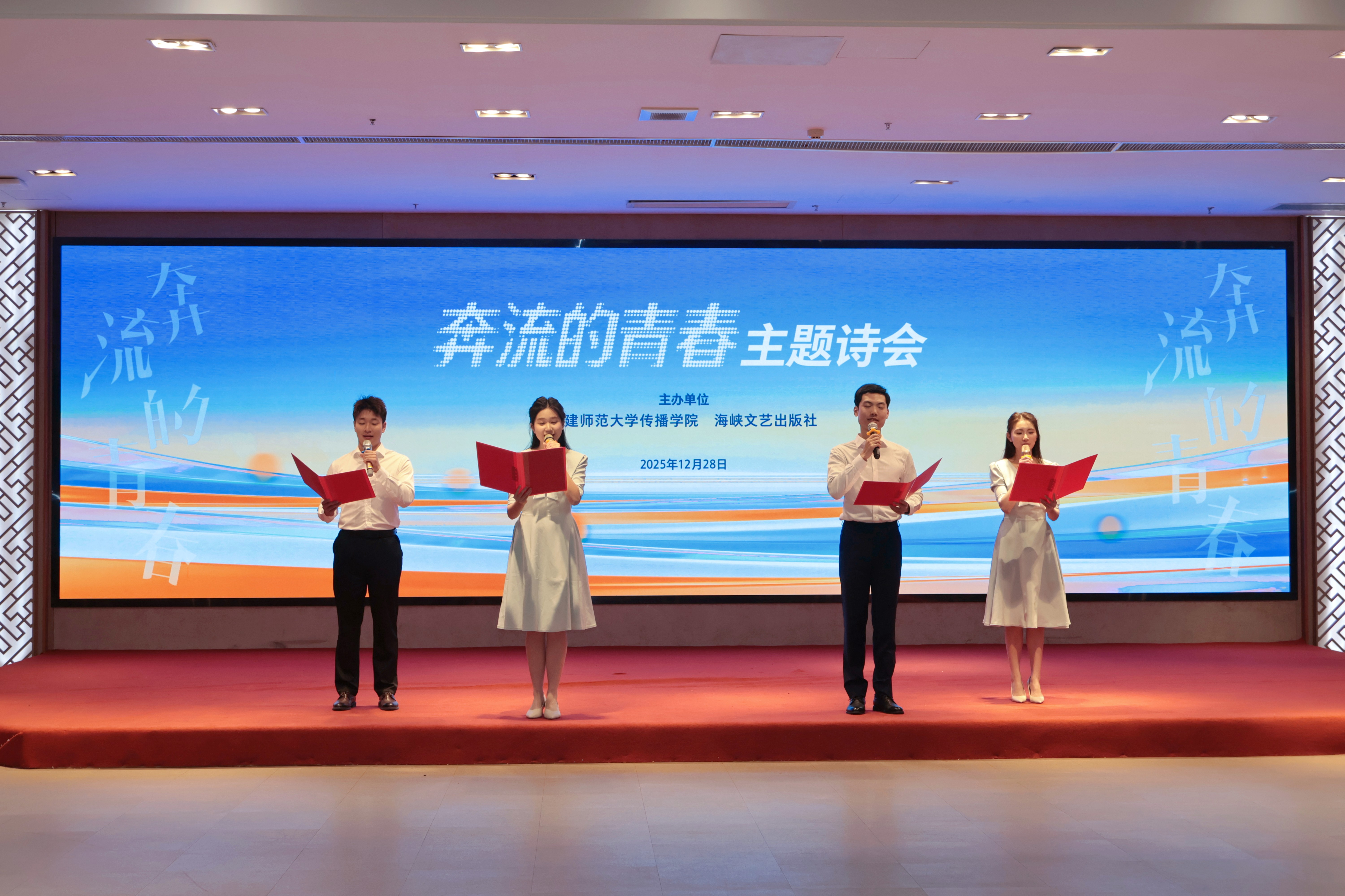 12月28日下午,由我院与海峡文艺出版社共同主办的“奔流的青春”主题诗会在宏达厅顺利举行。海峡文艺出版社社长林滨、我院党委书记郑文灿、扬州大学文学院教授王干、我校协和学院教授伍明春、福州文学院副院长年微漾、海峡朗诵艺术团副团长张弛、屏东中学教师倪兰及其带领的朗诵团队、我院播音与主持艺术专业师生、部分学生家长参加本次活动。本次诗会由我院播音系主任彭飙主持。