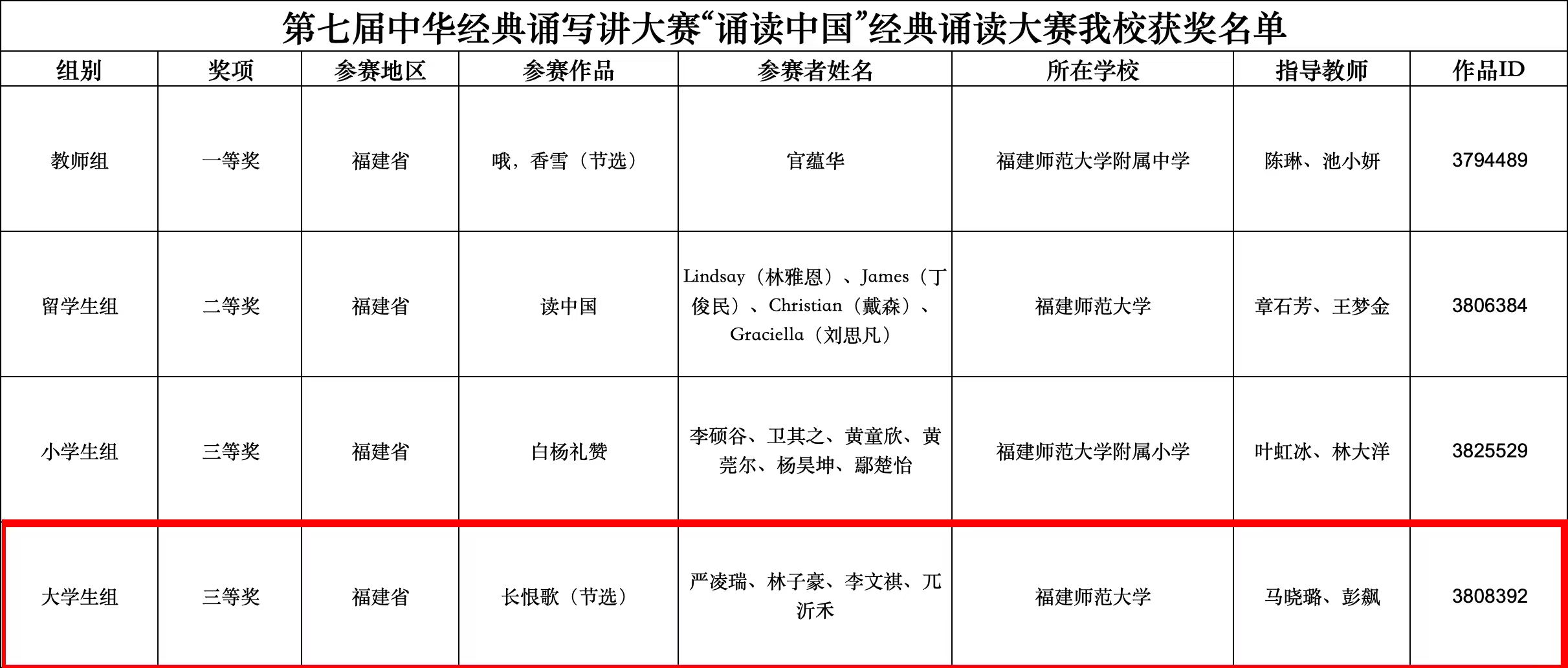近日,中华经典诵写讲大赛执委会对第七届中华经典诵写讲大赛“诵读中国”经典诵读大赛拟获奖名单进行公示,我校及附属学校参赛的多项作品获得佳绩。其中,我院师生的作品《长恨歌(节选)》获得三等奖。