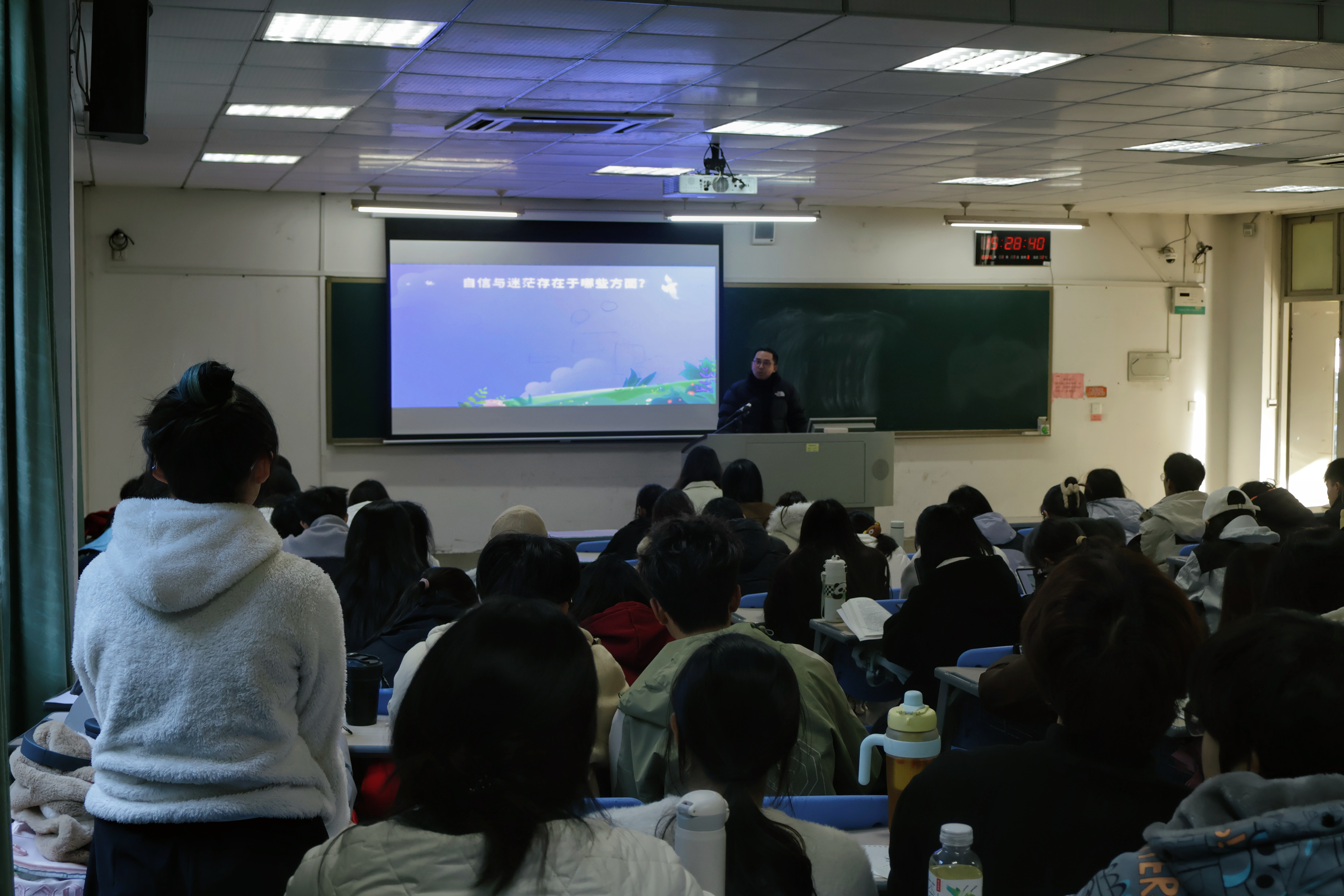 课上,朱杰忻围绕“青春与自信”“个体的发展”两大方面进行讲解,他表示青年学子应坚定“四个自信”,将信心转化为行动,在实践中把道路自信、理论自信、制度自信、文化自信转化成行动自觉,养成良好习惯。同时,他从国家、时代、个人三个维度阐释“四个自信”的内涵,并与同学们深入交流“四个自信”与“我”的关系。