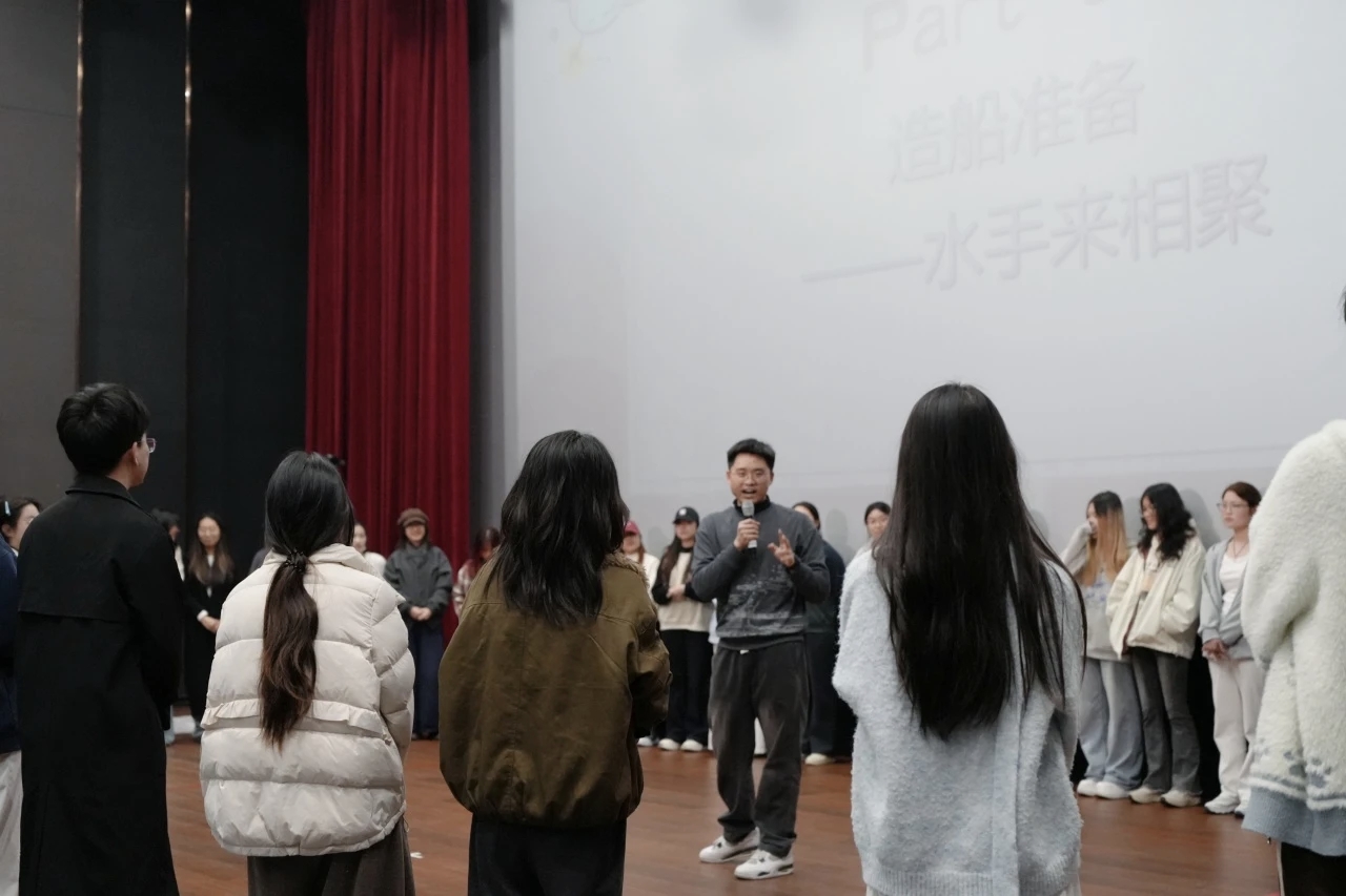 活动伊始,热身环节“水手来相聚”迅速点燃现场氛围。主持人发出口令后,同学们反应迅速、默契配合,按指定人数快速成组,趣味十足的互动打破了彼此间的拘谨,为后续团队协作环节的开展筑牢良好基础。