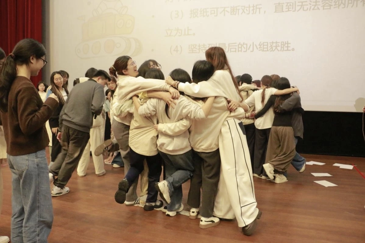 “报纸叠叠乐”暴风来临环节将活动氛围推向高潮。各小组根据指令不断对折报纸,在逐渐缩小的空间里,成员们相互扶持、紧密依靠,合理规划站位、共同商讨策略,不仅锻炼了统筹规划与临场应变能力,更在彼此支撑的过程中,增强了团队成员间的信任感。