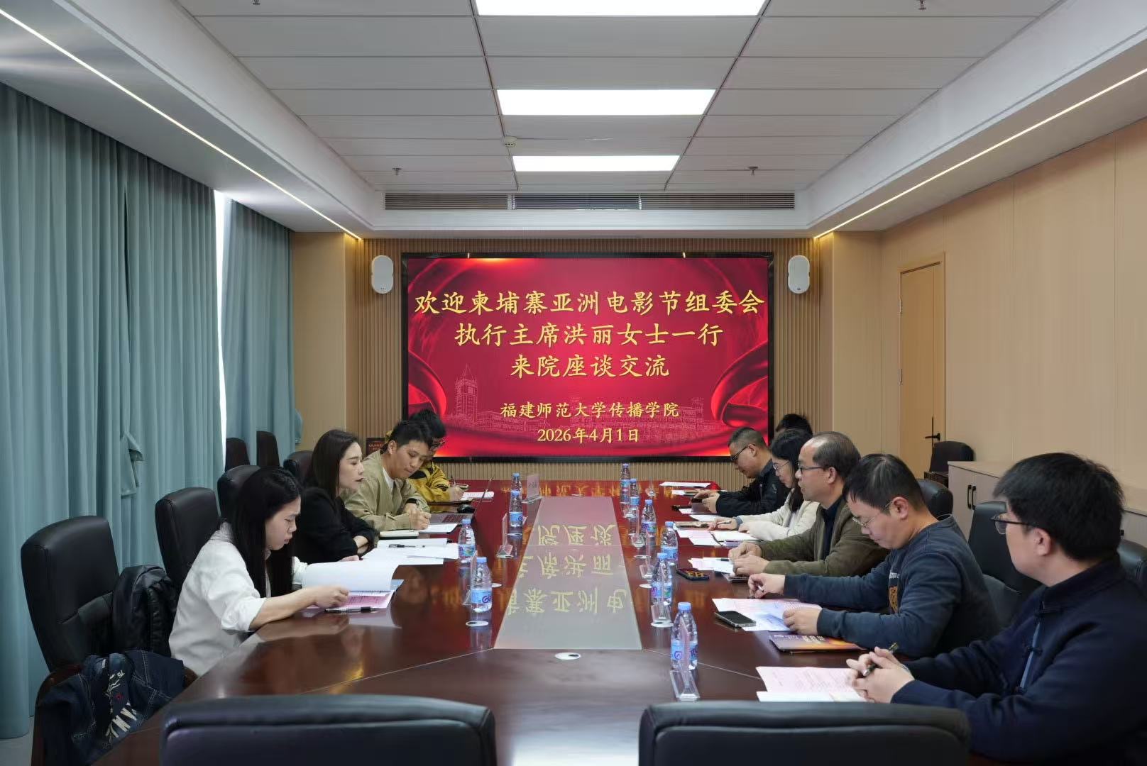 4月1日,柬埔寨亚洲电影节组委会执行主席洪丽女士一行到我院进行交流座谈。学院副院长吴青青,影视艺术系主任张经武,影视艺术系副主任章文哲及影视艺术系教师侯凯、高志丹、张亿参与座谈。座谈会由吴青青主持。