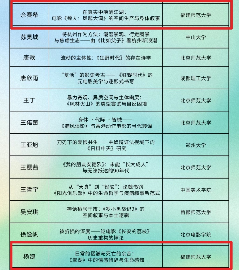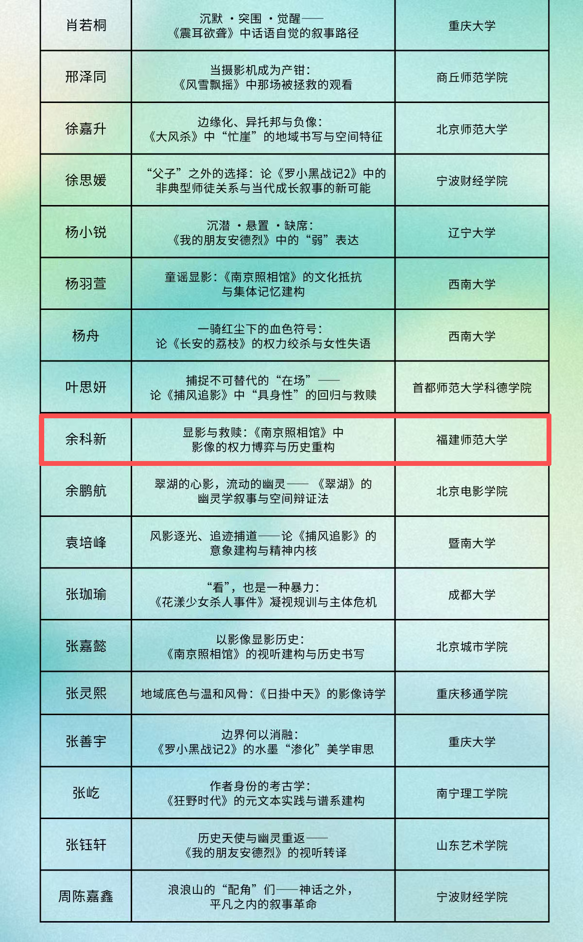 北京国际电影节·大学生电影节创立于1993年,至今已成功举办32届,始终秉承“青春激情、学术品位、文化意识”的宗旨,坚持以“大学生办、大学生看、大学生评、大学生拍”为特色,奠定了其不同于其他电影节的独特品格。2026年度大学生影评推选突出“大学生评”的特色,致力于激励大学生群体对中国电影的关注和热爱,其影评推选环节以专业、严谨著称,旨在发掘热爱影视、善于思考的青年评论人才。本届影评推选收到作品700余篇,经过严格匿名评审推选,共有90篇作品入选最终轮推选,其中本科生组入选45篇,研究生组入选45篇。我院2025级艺术学(影视)专业硕士研究生佘赛希的《在真实中唤醒江湖:电影<镖人:风起大漠>的空间生产与身体叙事》、杨婕的《日常的褶皱与死亡的余音:<翠湖>中的情感修辞与生命感知》,2022级广播电视编导专业本科生余科新的《显影与救赎 :〈南京照相馆〉中影像的权力博弈与历史重构》凭借影视专业娴熟的理论知识功底与独到的影像见解能力而成功入选。
