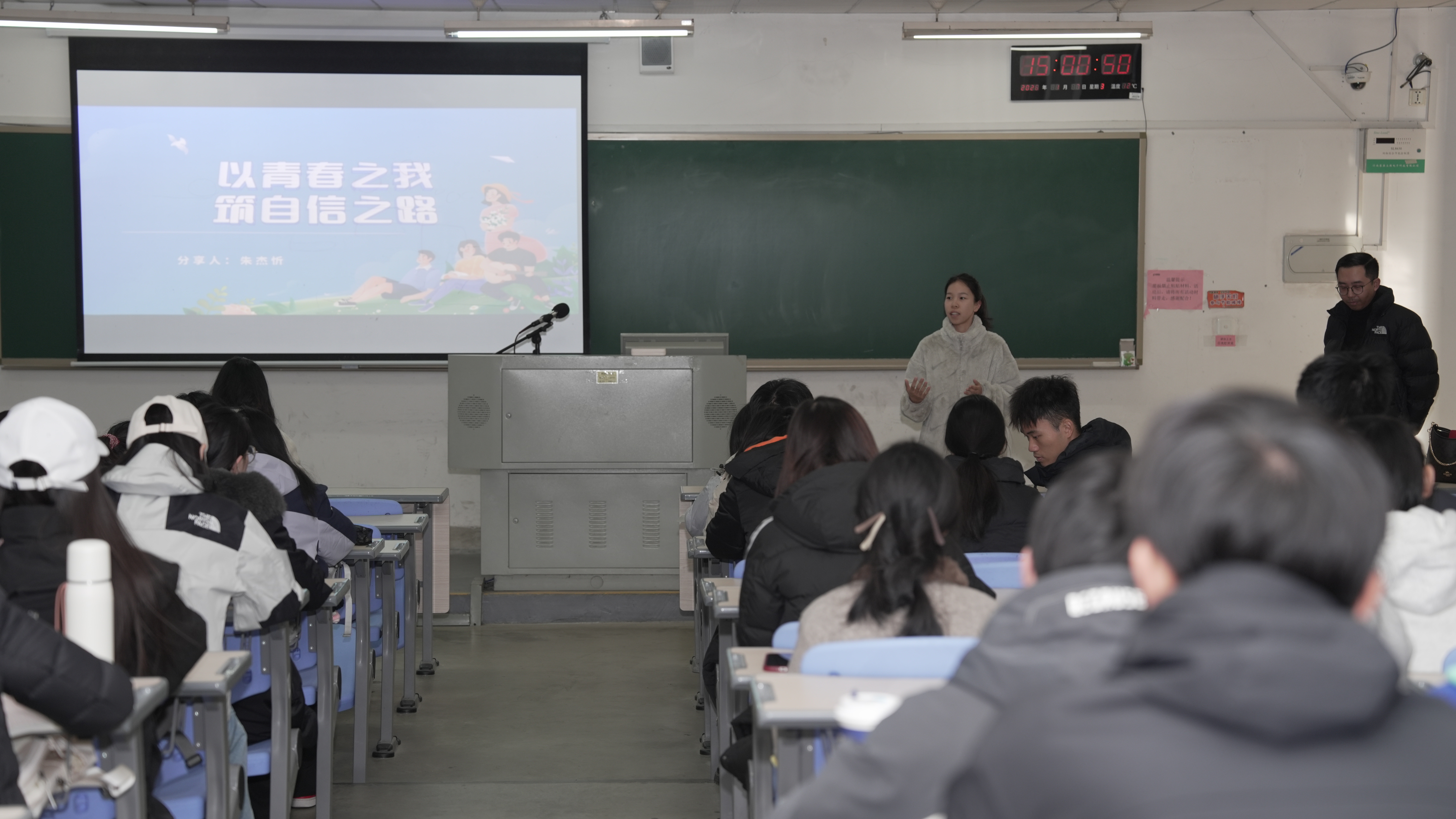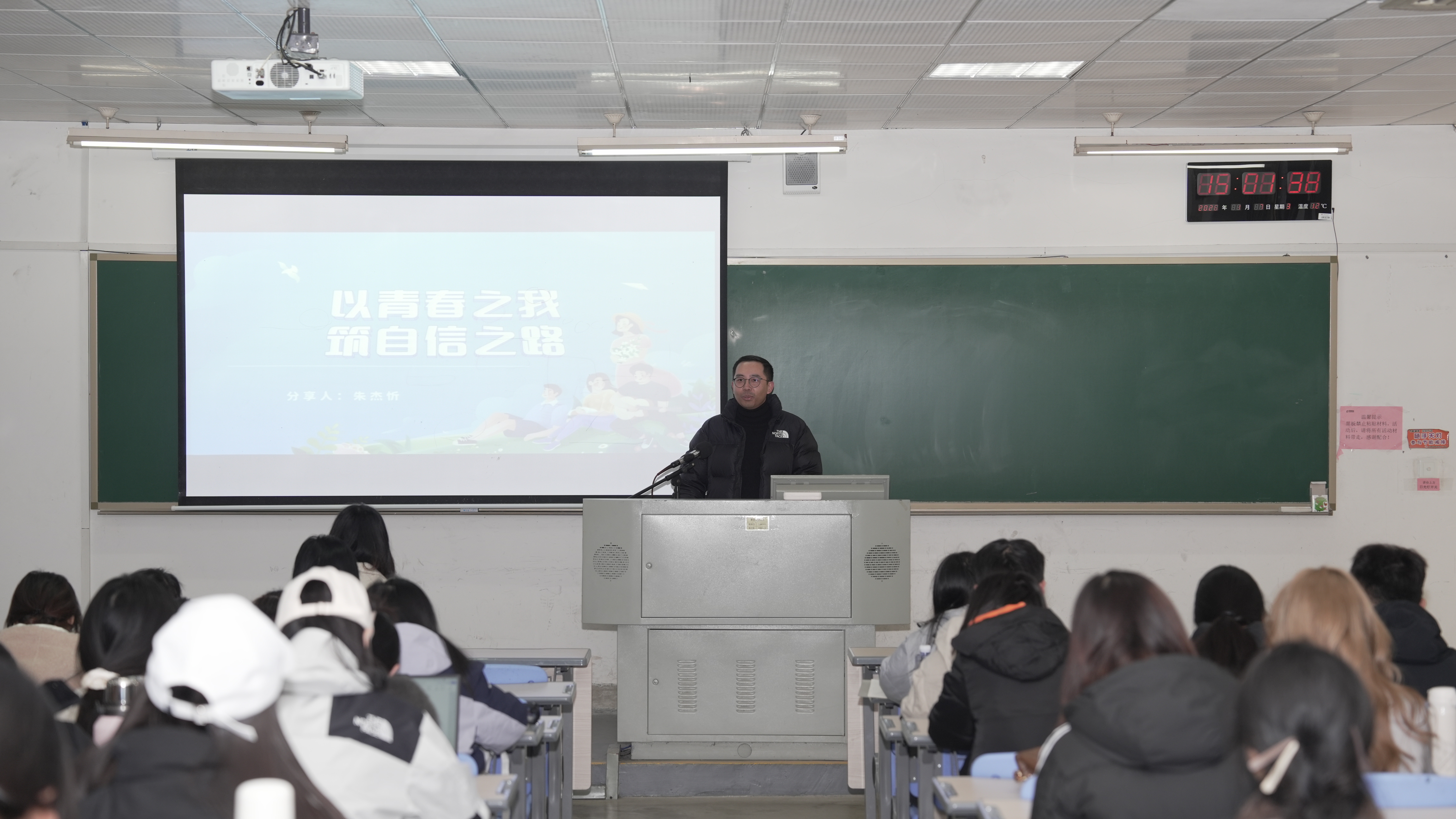 课上,朱杰忻围绕“青春与自信”“个体的发展”两大方面进行讲解,他表示青年学子应坚定“四个自信”,将信心转化为行动,在实践中把道路自信、理论自信、制度自信、文化自信转化成行动自觉,养成良好习惯。同时,他从国家、时代、个人三个维度阐释“四个自信”的内涵,并与同学们深入交流“四个自信”与“我”的关系。